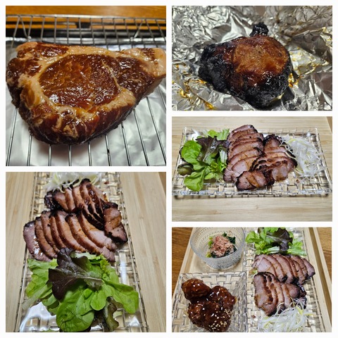 牛肉の値段が高い(笑)…今年のおせちは焼き豚を使おうかと思って試作。生姜、蜂蜜、醤油、みりん、お酒で作った汁に漬けてオーブンに投入するだけで···