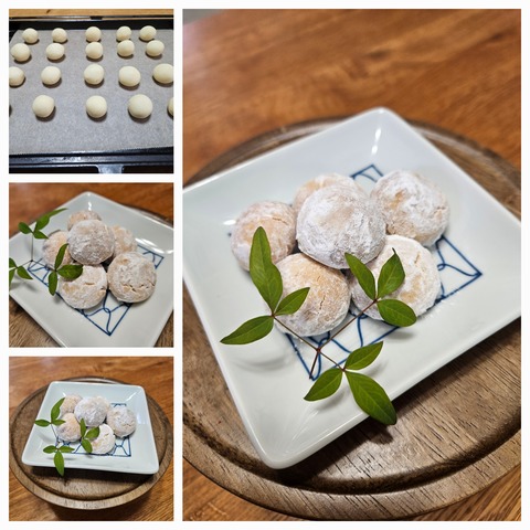 おやつ用に焼いたのは『スノーボウル』甘さ控えめ、米粉を使っています。サクッホロッと溶ける生地頑張りすぎず準備できるシンプルなおやつひと息入れ···